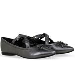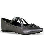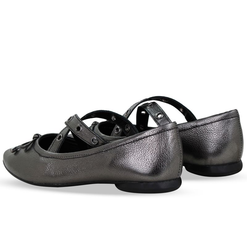 Sapatilha em couro metalizado roma pewter. De solado rasteiro e bico fino. Possui delicado enfeite de laço sobre o pé e tiras com ilhós onix que transpassam o peito do pé.