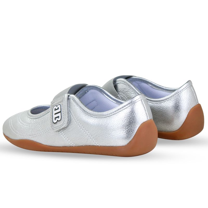 Tênis em couro metalizado roma prata. De solado rasteiro na cor natural e bico redondo. Possui abertura sobre o pé e fechamento em tira com elástico e velcro que possibilita o ajuste ao pé.