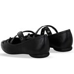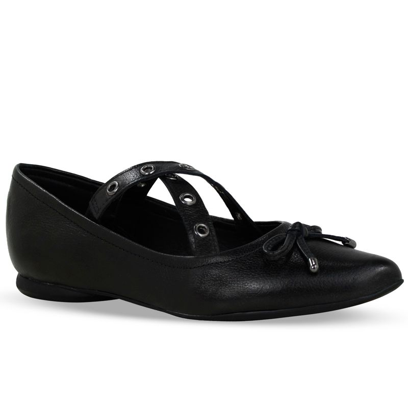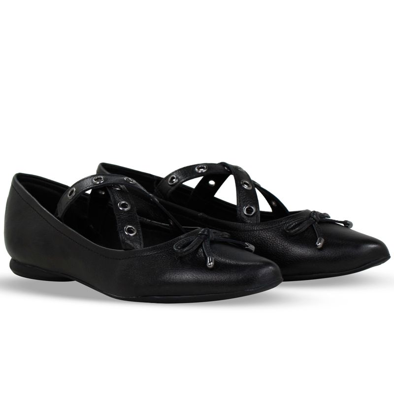 Sapatilha em couro metalizado roma preto. De solado rasteiro e bico fino. Possui delicado enfeite de laço sobre o pé e tiras com ilhós onix que transpassam o peito do pé.