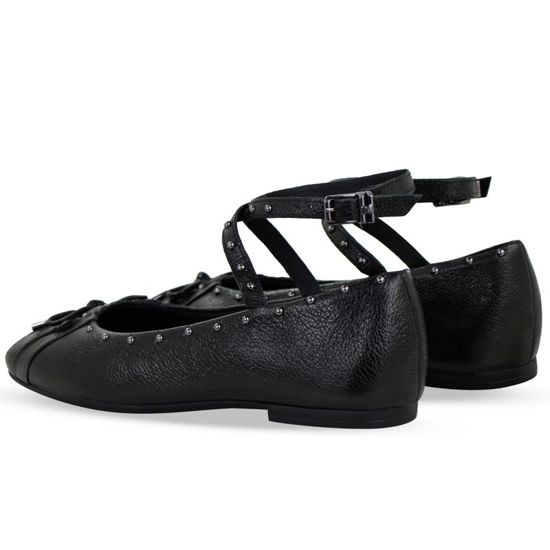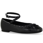 Sapatilha em couro metalizado roma preto. De solado rasteiro e bico redondo. Possui detalhes em metal onix e tira ajustável que envolve o tornozelo com fivela de metal onix.