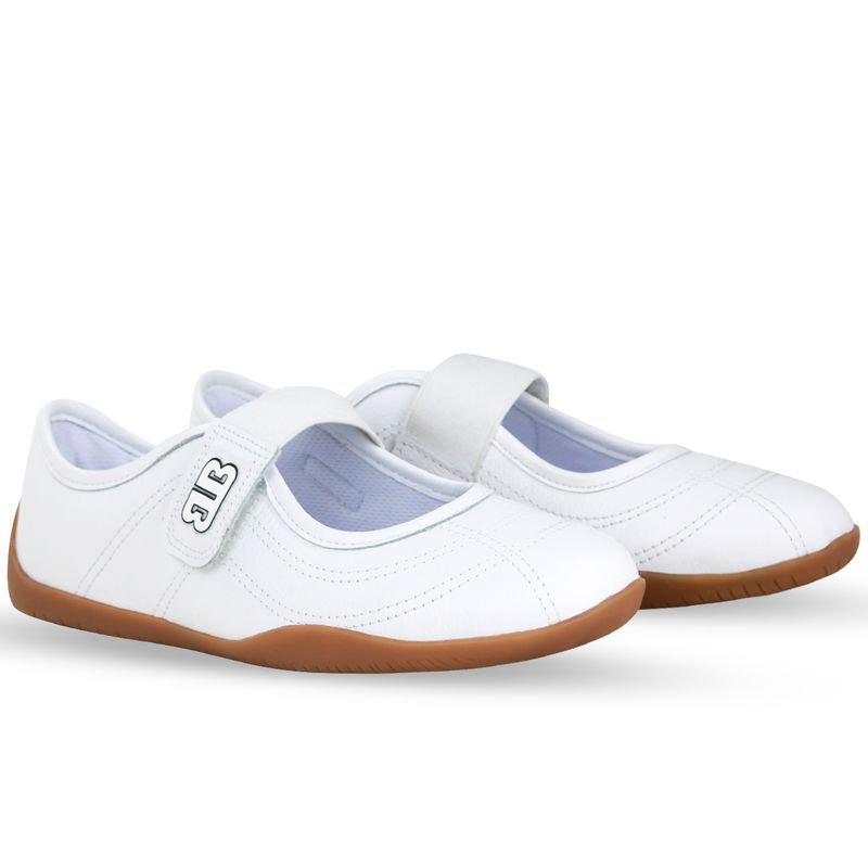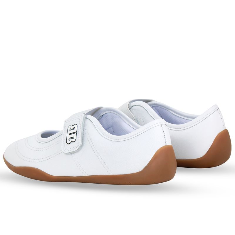 Tênis em couro napa branco. De solado rasteiro na cor natural e bico redondo. Possui abertura sobre o pé e fechamento em tira com elástico e velcro que possibilita o ajuste ao pé.