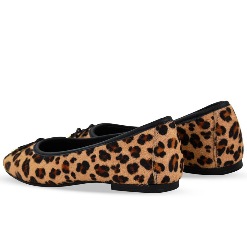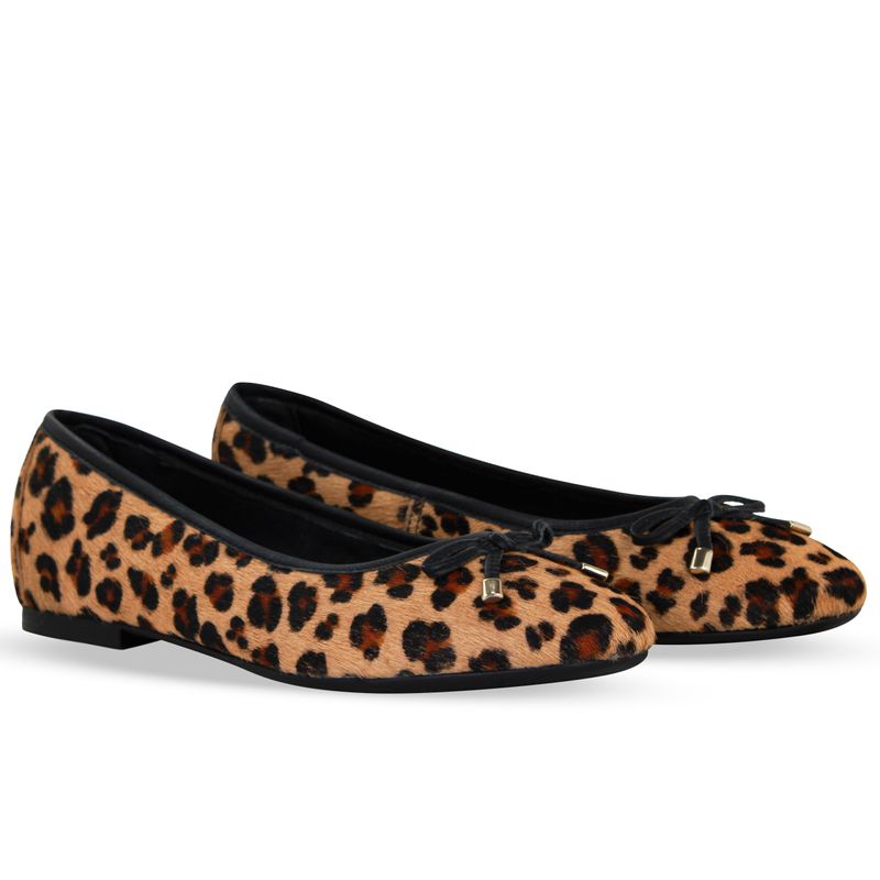 Sapatilha em couro poney onça. De solado rasteiro e bico redondo. Possui delicado enfeite de laço sobre o pé. Modelo clássico e indispensável.