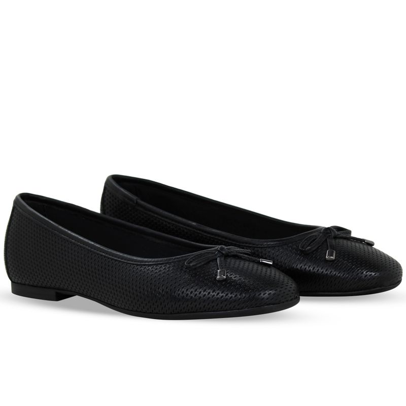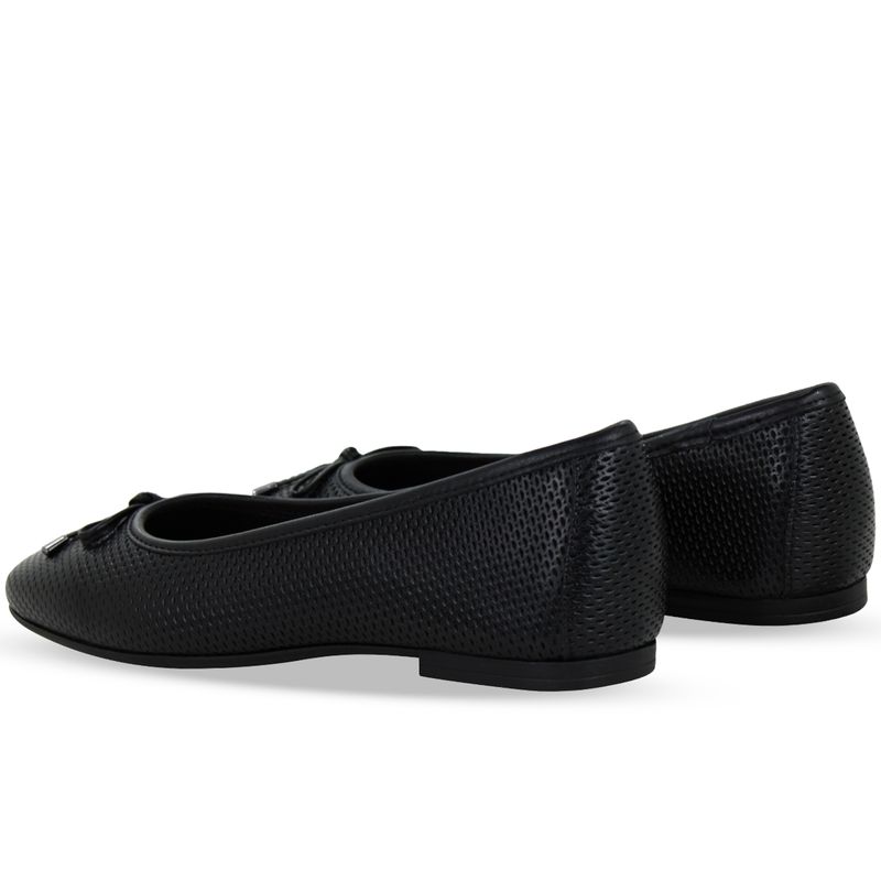 Sapatilha em couro veneza preto. De solado rasteiro e bico redondo. Possui delicado enfeite de laço sobre o pé. Modelo clássico e indispensável.