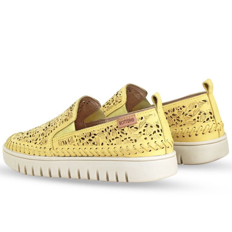 Sapato em couro atanado napoli amarelo manteiga. Possui solado rasteiro em cor natural. Gáspea com detalhes a laser e elástico nas laterais, possibilitando maior facilidade ao calçar.