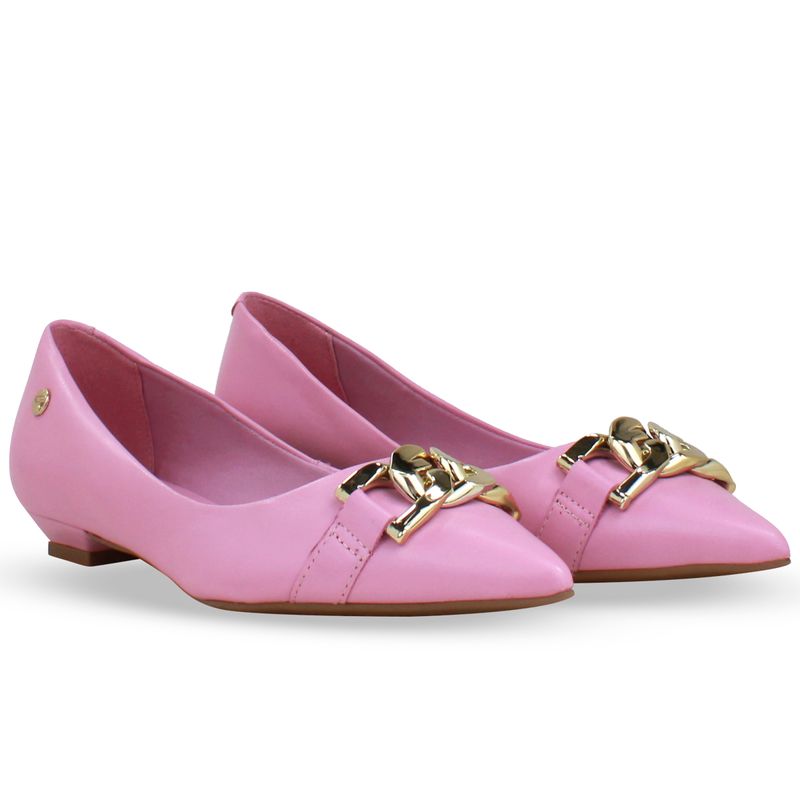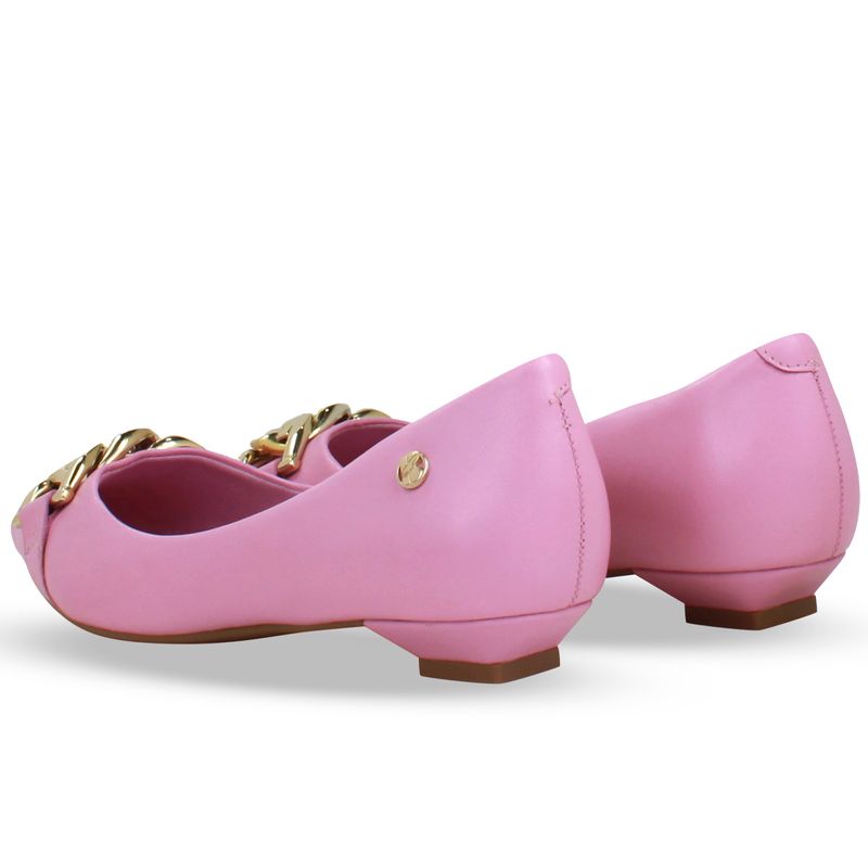 Sapato em couro atanado napoli rosa. De salto interno baixo e bico fino. Com detalhe em enfeite de elo dourado sobre o pé.
