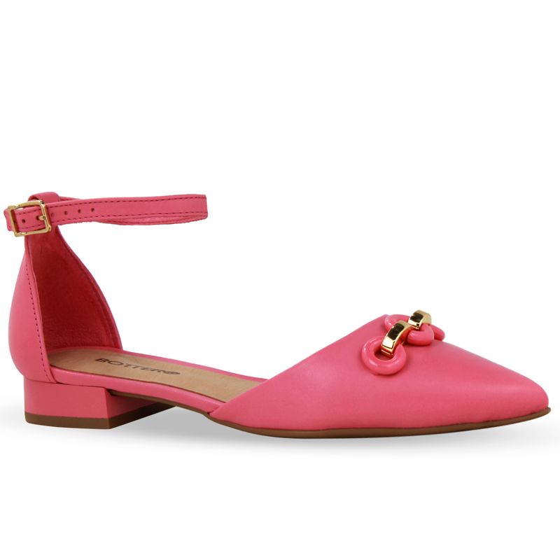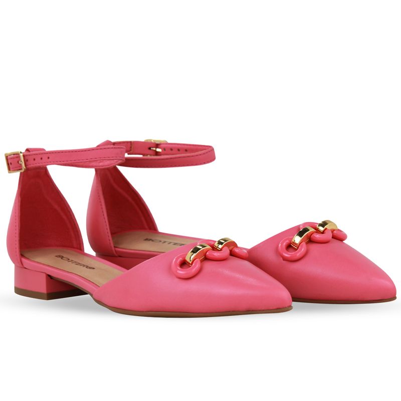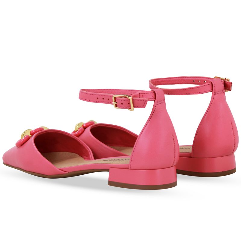 Sapato em couro atanado napoli rosa chá. De salto baixo e bico fino. Possui traseiro fechado com tira ajustável e fivela de metal dourado. Gáspea com lindo detalhe em elos sobre o pé.