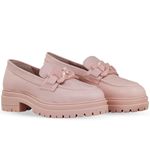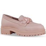 Sapato em couro atanado napoli rosa pele. De solado tratorado preto, possui enfeites de elo em plástico sobre o pé.