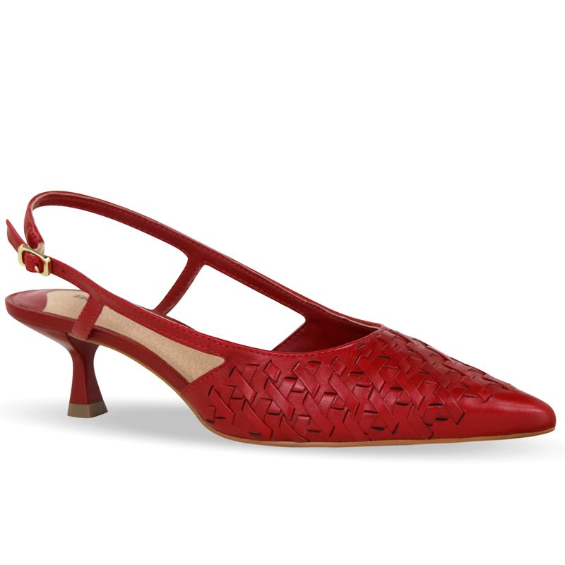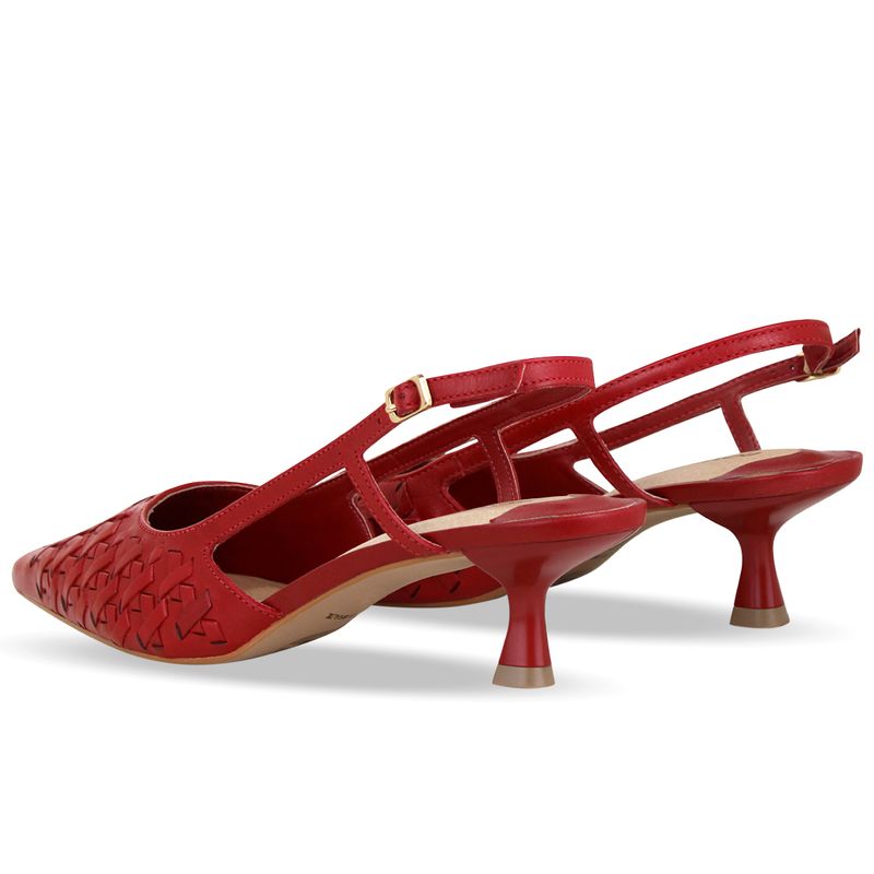 Sapato em couro atanado napoli rouge. De salto baixo e bico fino. Possui traseiro aberto com tira ajustável e fivela de metal.