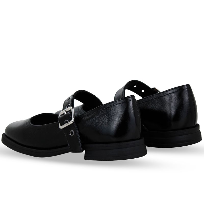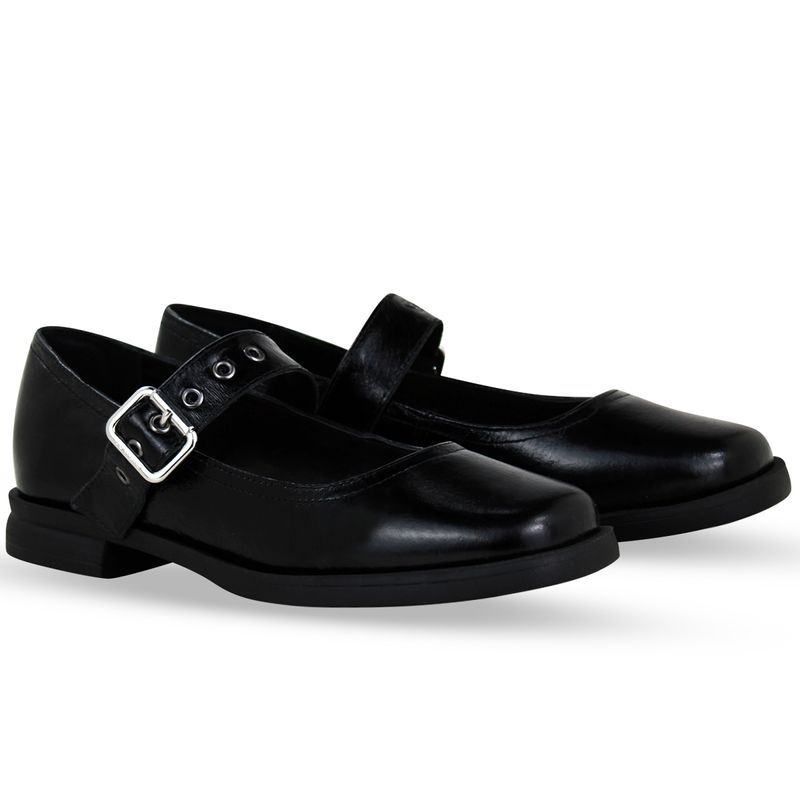 Sapato em couro atenas preto. De salto baixo e bico redondo. Possui abertura sobre o pé, com tira ajustável e metais em prata.