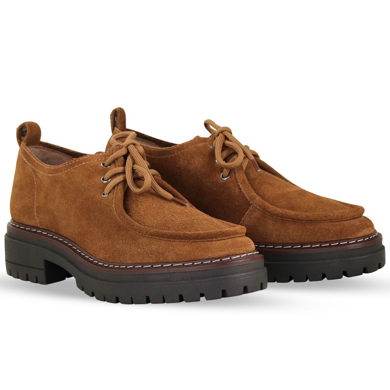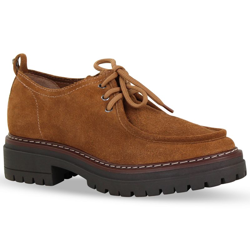 Sapato em couro camurça castanho. De solado tratorado e bico redondo. Possui fechamento em cadarços.