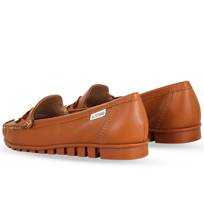 Sapato mocassim em couro burnish caramelo. De solado rasteiro e bico redondo. Possui lindo detalhe de laço sobre o pé.