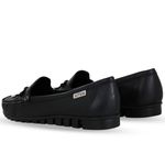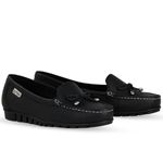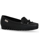 Sapato mocassim em couro burnish preto. De solado rasteiro e bico redondo. Possui lindo detalhe de laço sobre o pé.