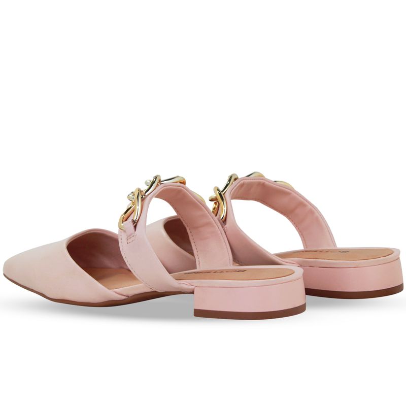 Sapato mule em couro atanado napoli rosa pele. De salto baixo e bico fino. Possui abertura sobre o pé e lindo detalhe em elos dourado.