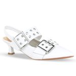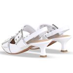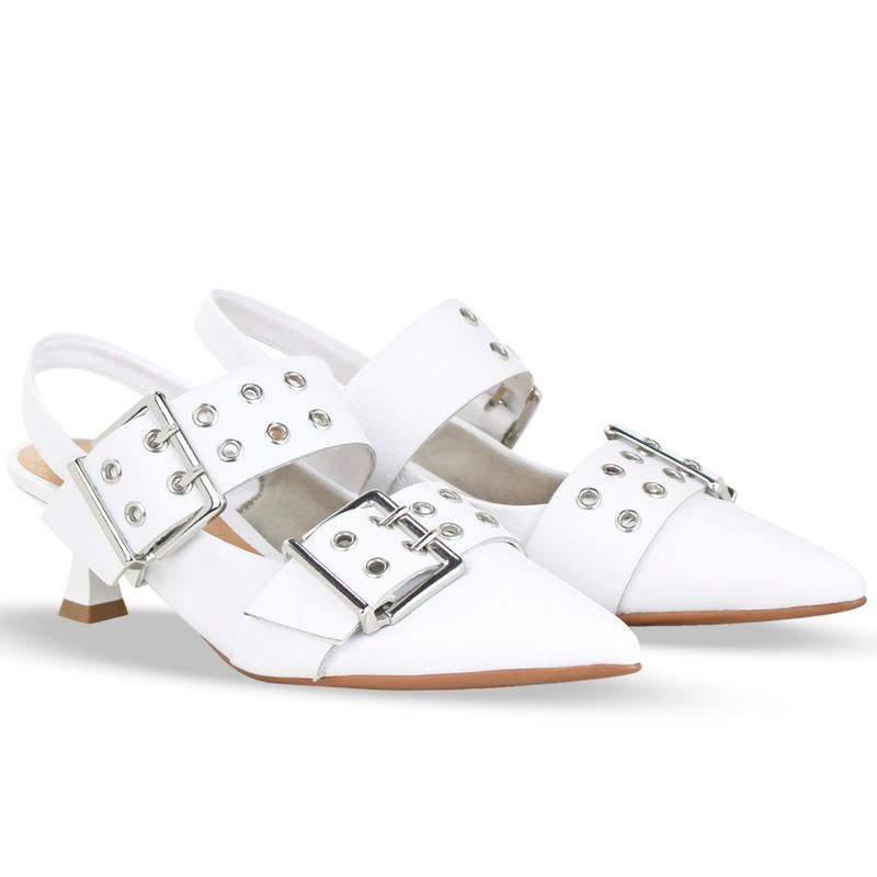 Sapato em couro atanado napoli branco. De salto ampulheta baixo e bico fino. Possui traseiro aberto com tira fina que possui elástico para proporcionar firmeza no calcanhar. Detalhes em tiras largas com enfeites em metal prata e fivela prata.