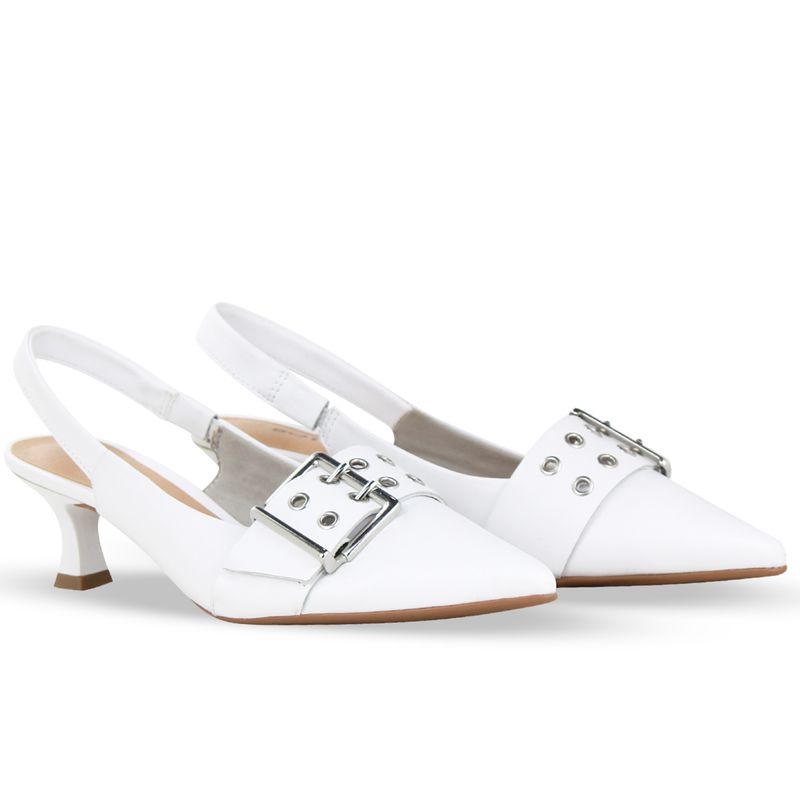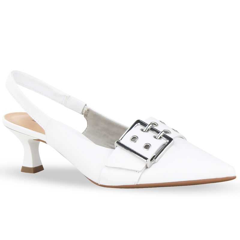Sapato scarpin em couro atanado napoli branco. De salto ampulheta baixo e bico fino. Modelo possui traseiro aberto com tira fina com elástico, proporcionando total ajuste ao pé. Detalhe em tira larga ajustável e metais onix sobre o pé.