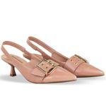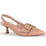 Sapato scarpin em couro atanado napoli brown sugar. De salto ampulheta baixo e bico fino. Modelo possui traseiro aberto com tira fina com elástico, proporcionando total ajuste ao pé. Detalhe em tira larga ajustável e metais dourado sobre o pé.