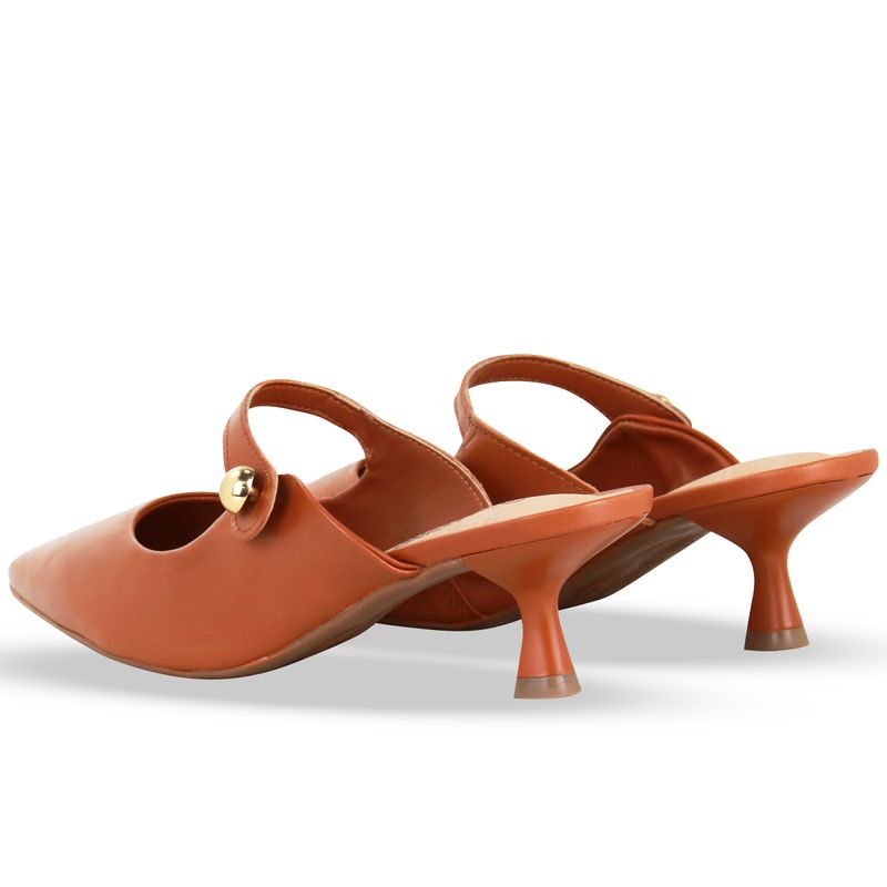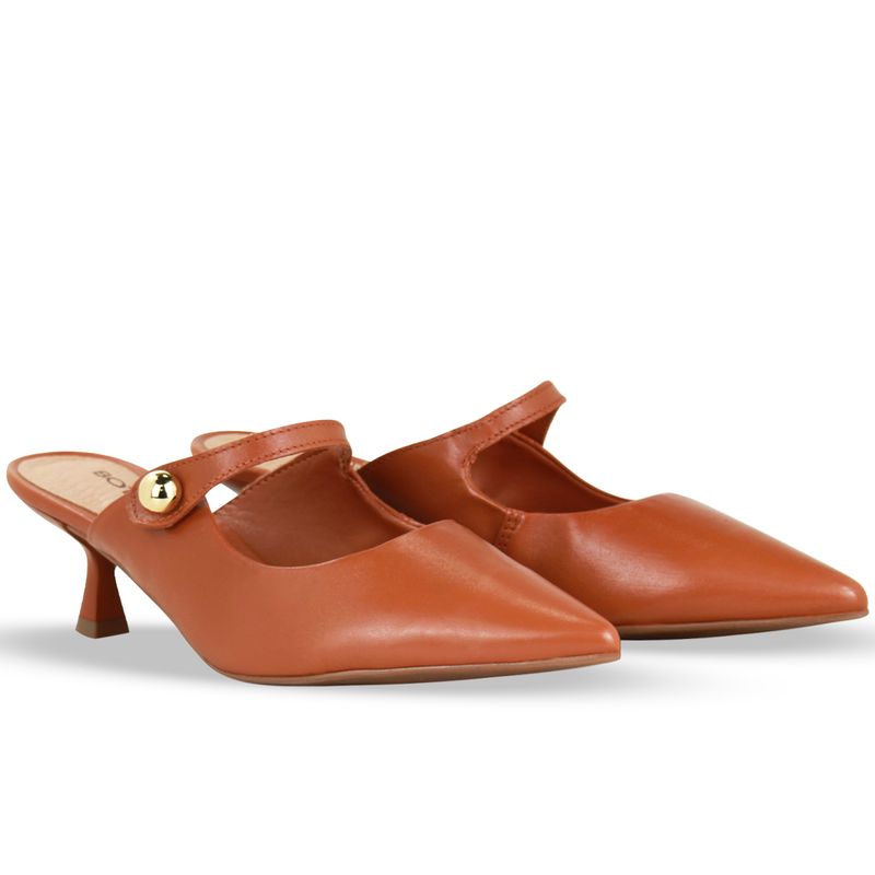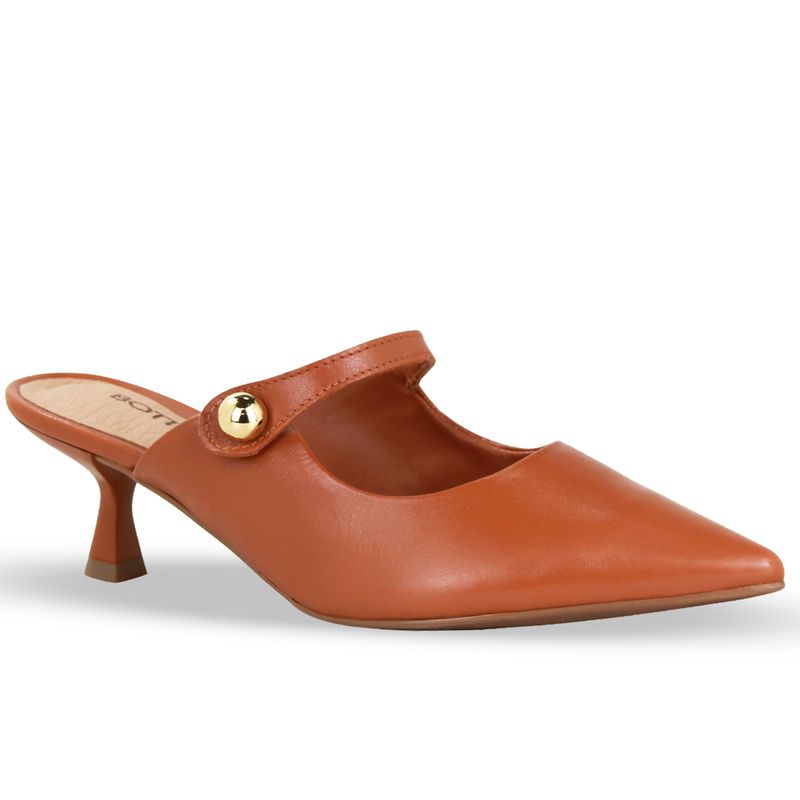 Sapato scarpin em couro atanado napoli caramelo. De salto ampulheta baixo e bico fino. Modelo possui traseiro aberto e detalhe em tira com enfeite de metal dourado.
