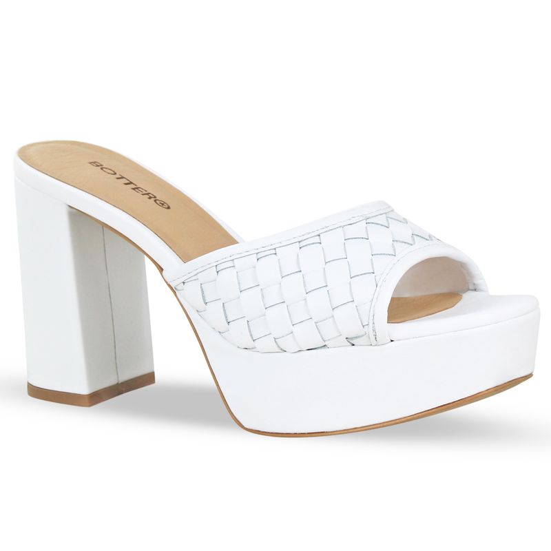 Tamanco em couro atanado napoli branco. De salto meia pata alto. Possui gáspea com material trançado.