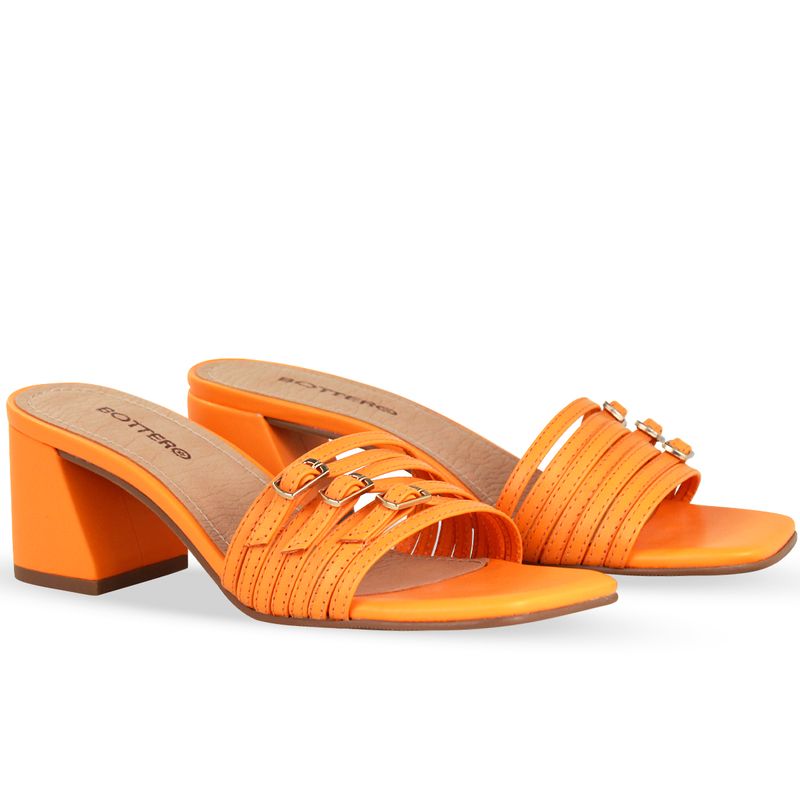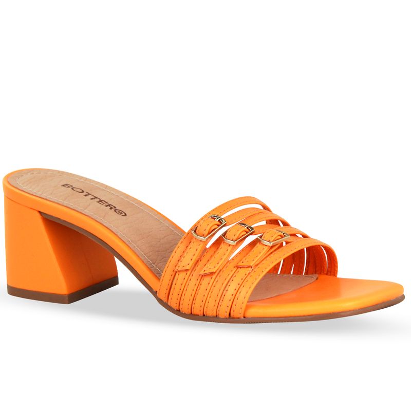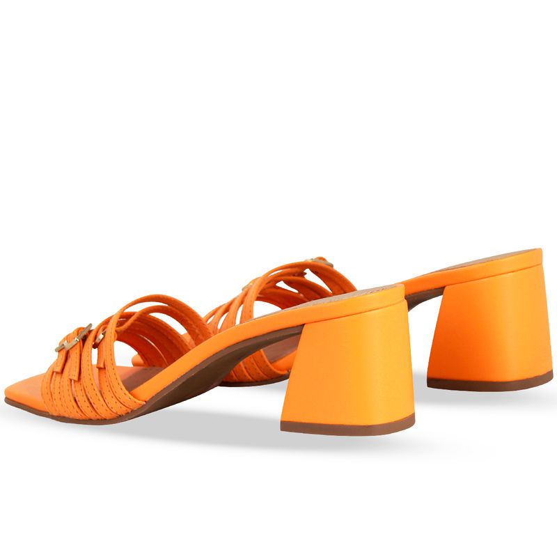 Tamanco em couro atanado napoli laranja. De salto bloco encapado. Gáspea com tiras finas e detalhes em fivelas de metal dourado.