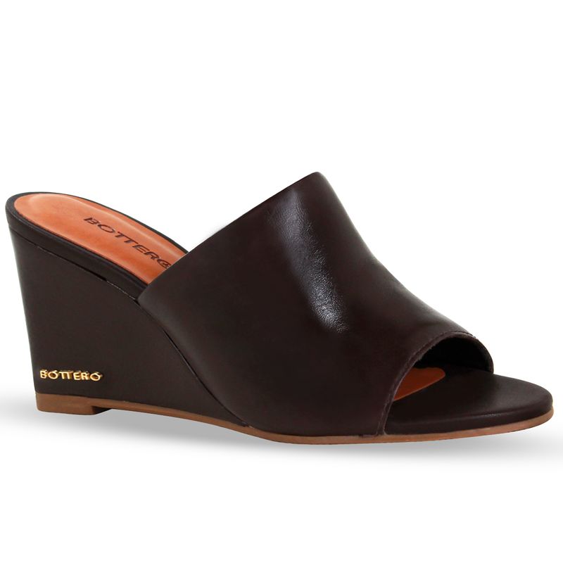 Tamanco em couro atenas marrom. De salto anabela alto e detalhe com nome da marca no salto. Gáspea larga com abertura nos dedos.