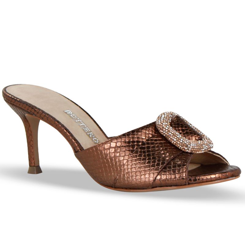 Tamanco em couro snake bronze. De salto fino alto. Gáspea larga com abertura nos dedos. Possui enfeite de metal com brilho sobre o pé.