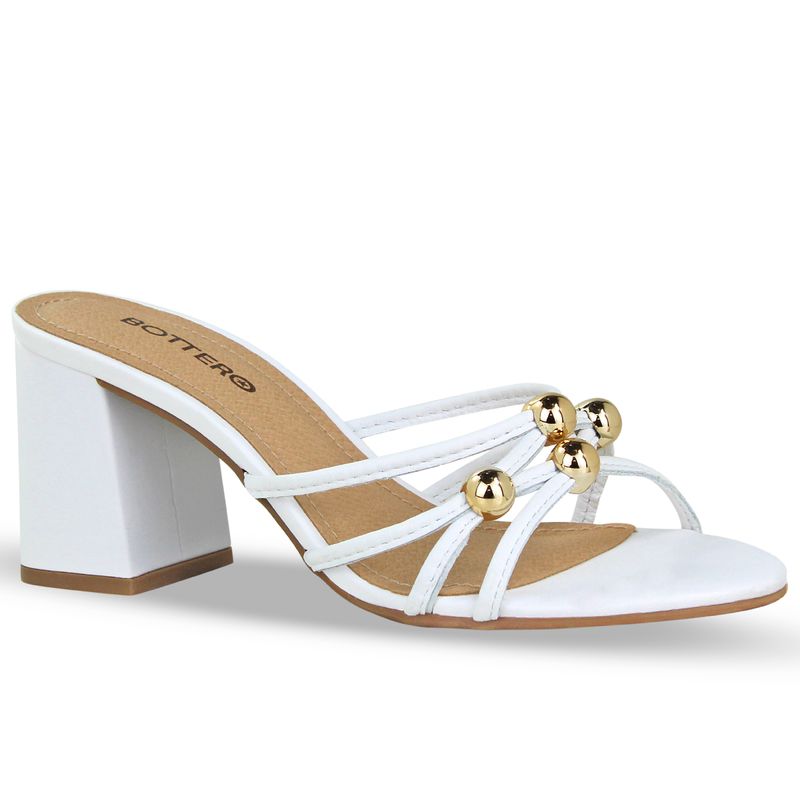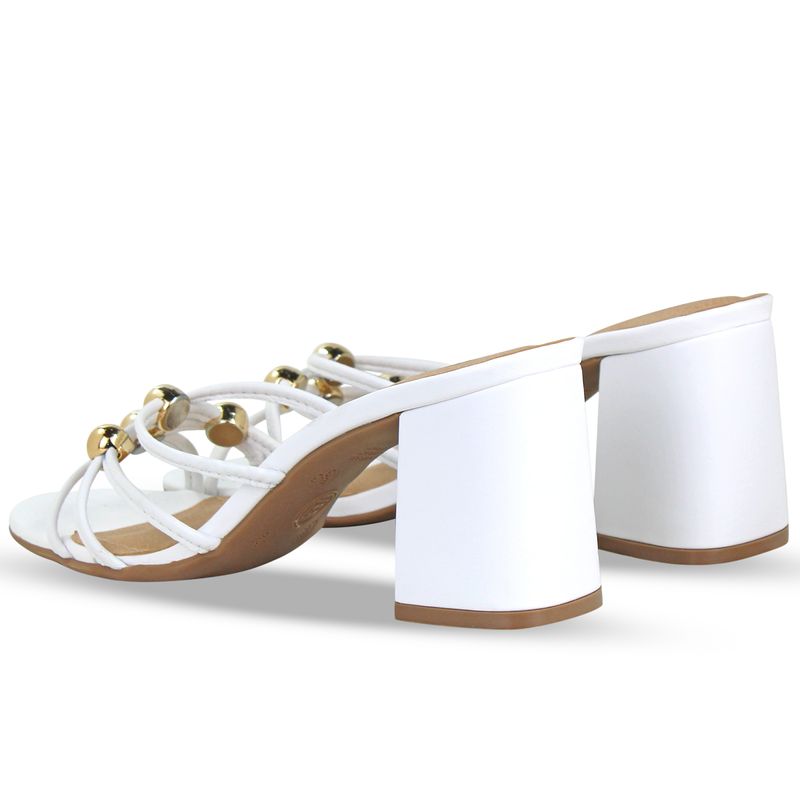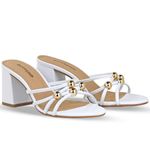 Tamanco em couro burnish branco. De salto bloco alto. Gáspea transpassada com tiras finas e detalhe em metal dourado, trazendo delicadeza ao modelo.