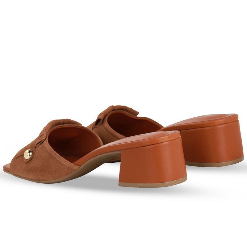 Tamanco em couro camurça castanho. De salto bloco médio. Possui detalhes na gáspea e enfeite dourado.