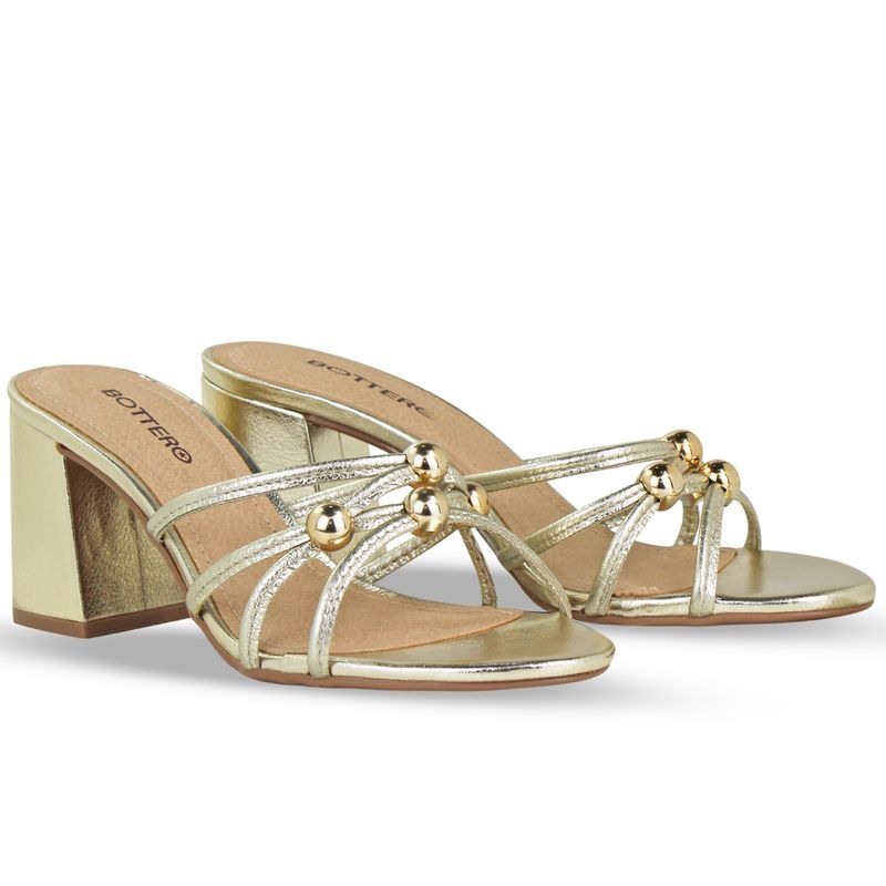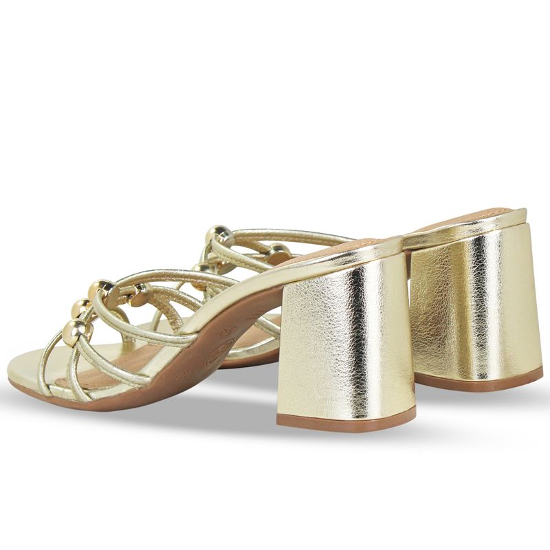 Tamanco em couro metalizado roma dourado. De salto bloco alto. Gáspea transpassada com tiras finas e detalhe em metal dourado, trazendo delicadeza ao modelo.