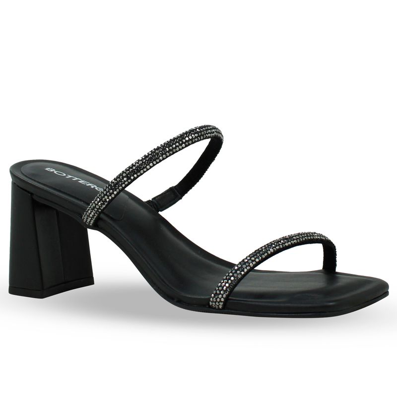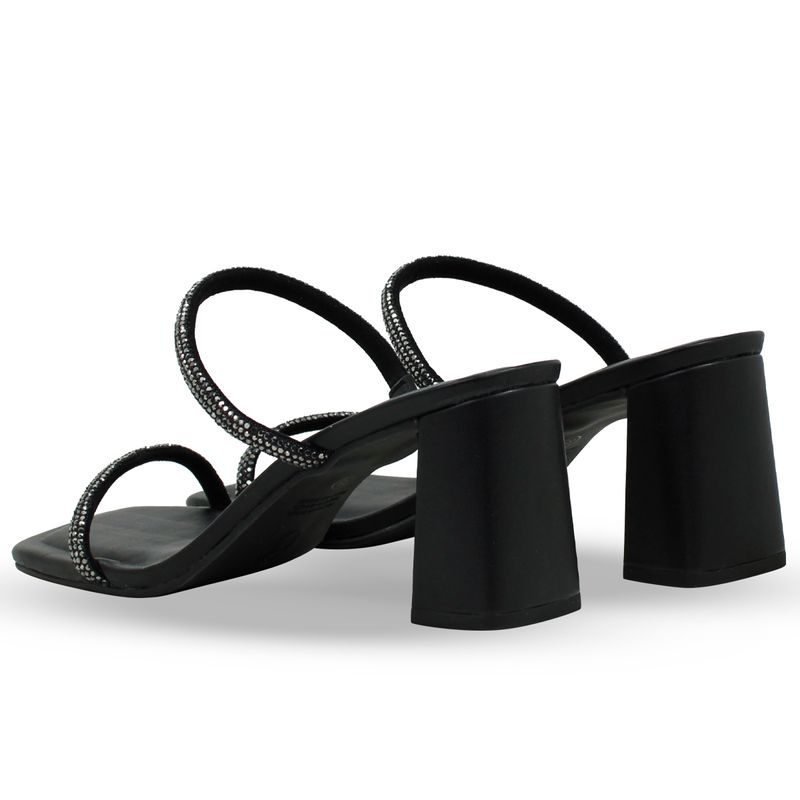 Tamanco preto. De salto bloco alto e palmilha macia. Tiras com lindo detalhe em strass, trazendo charme e sofisticação ao modelo.