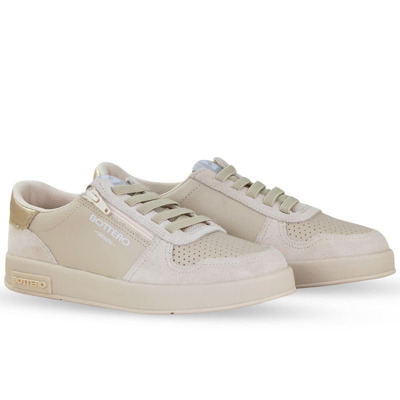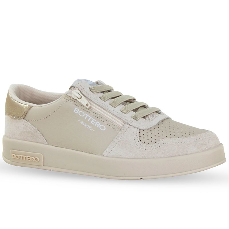 Tênis em couro camurça marfim. De solado rasteiro e bico redondo. Possui fechamento em zíper na lateral externa e cadarços em elásticos que possibilitam maior ajuste ao pé.