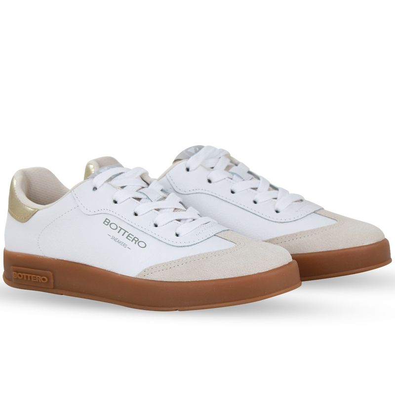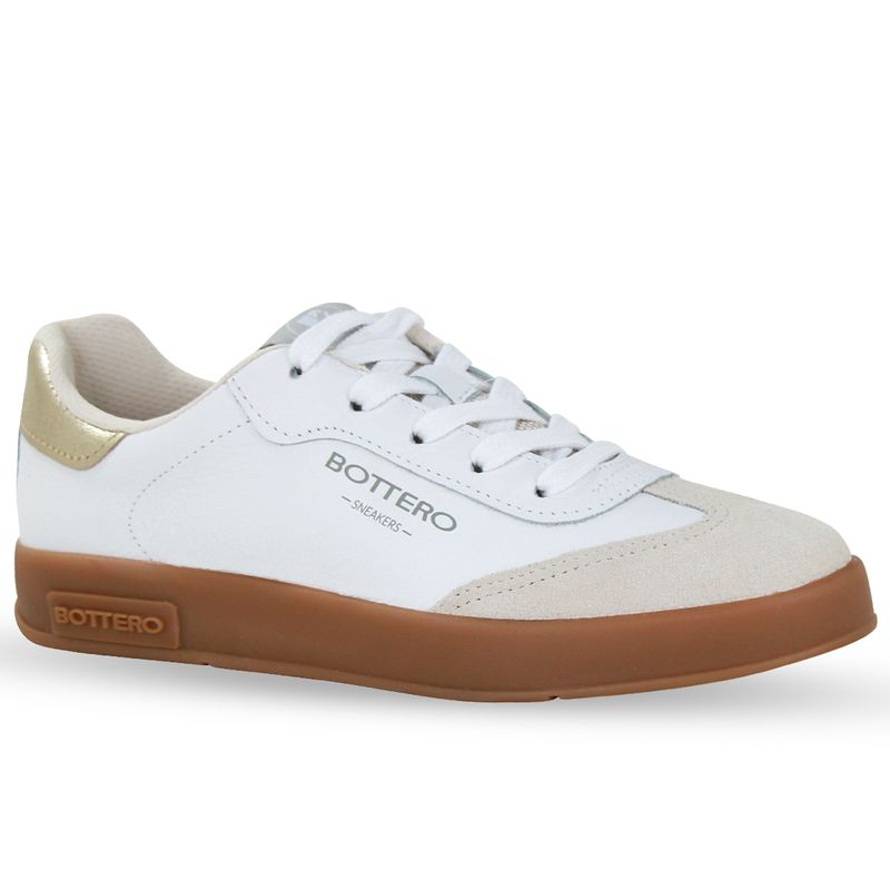 Tênis em couro napa branco. Detalhe em couro dourado no traseiro e couro camurça marfim no bico. De solado rasteiro bege com fechamento em cadarços branco. Logo da marca na lateral externa do pé.