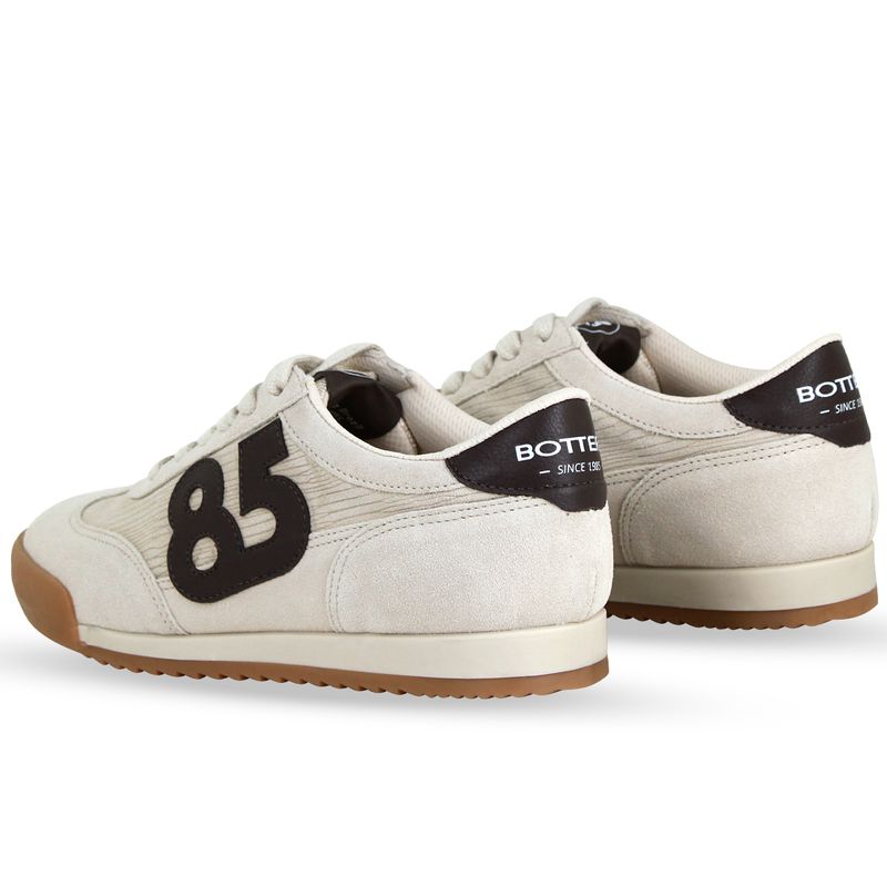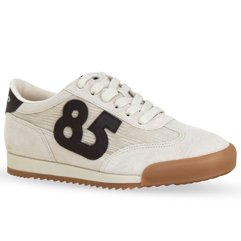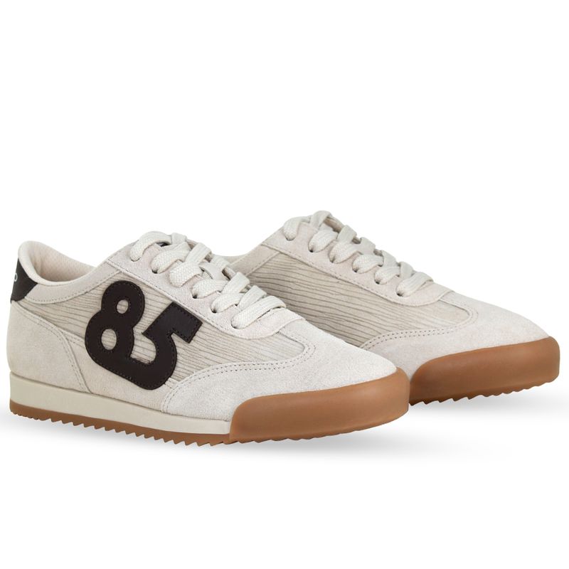 Tênis em couro camurça marfim. De solado rasteiro na cor natural. Possui fechamento em cadarços e detalhe no traseiro em couro café. Detalhe do numero 85 na lateral externa, que remete o ano em que a marca foi criada.