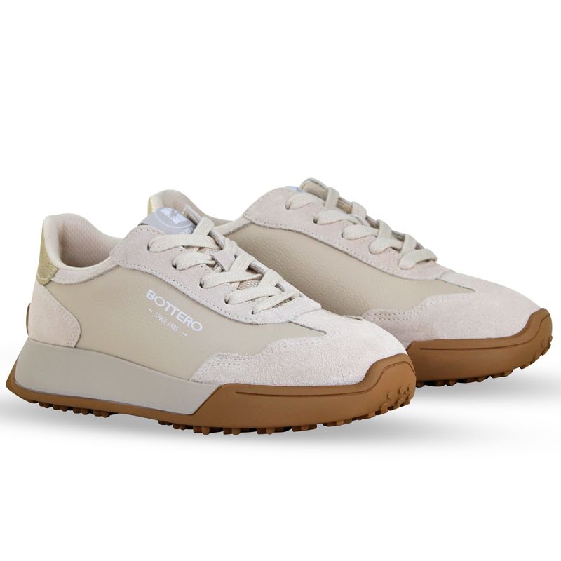 Tênis em couro camurça marfim. De solado robusto na cor natural. Possui fechamento em cadarços e detalhe no traseiro em couro dourado. Detalhe com o nome da marca na lateral.