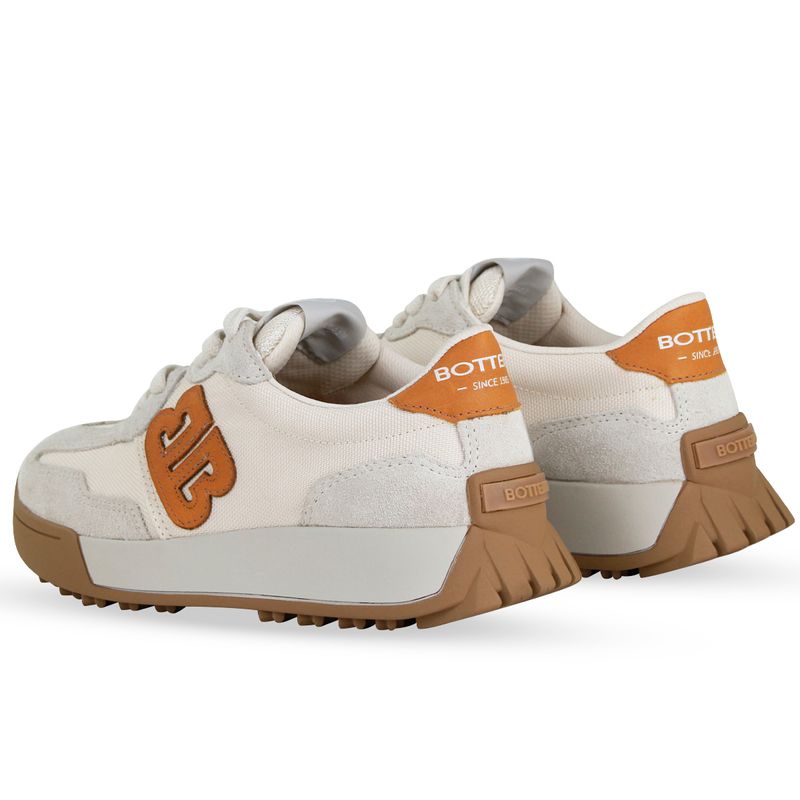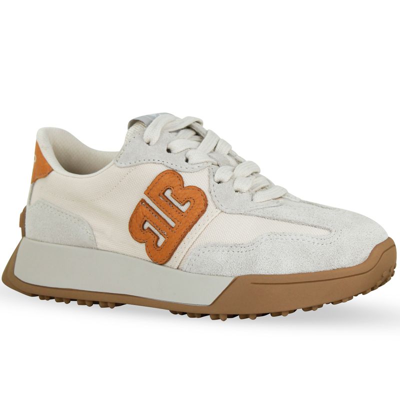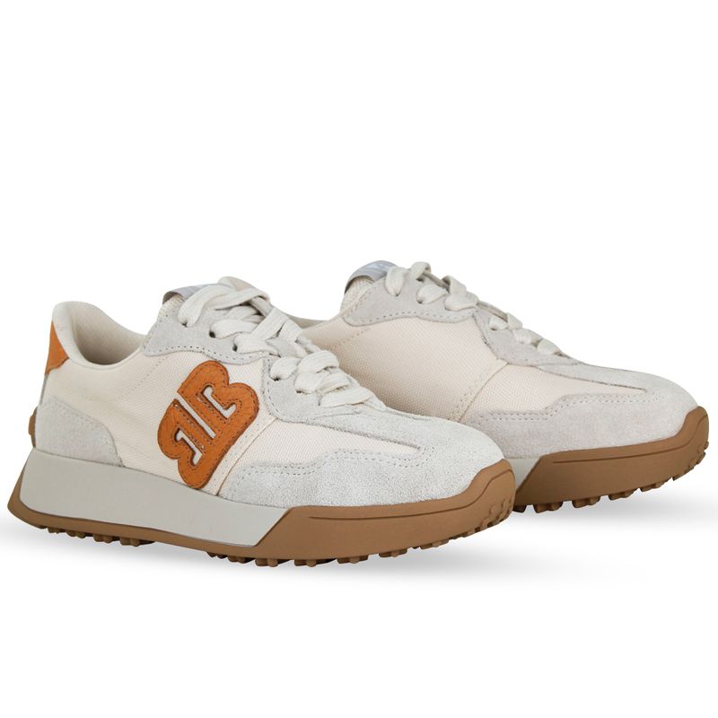 Tênis em couro camurça marfim. De solado robusto na cor natural. Possui fechamento em cadarços e detalhe no traseiro em couro mostarda. Detalhe com a letra B na lateral.