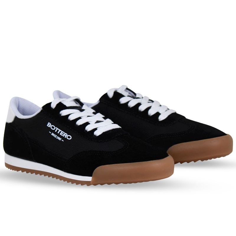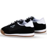 Tênis em couro camurça preto. De solado rasteiro na cor natural. Possui detalhe em couro napa branco no traseiro e fechamento em cadarços.