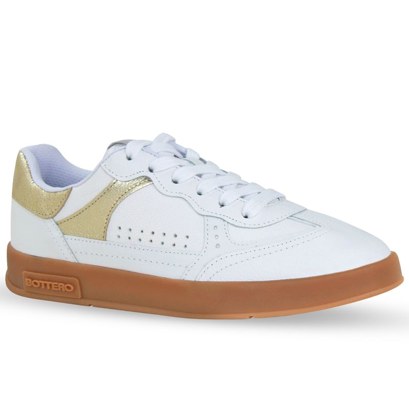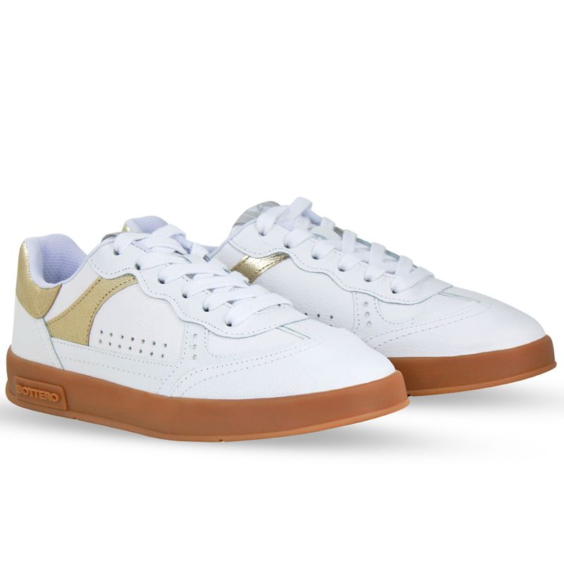 Tênis em couro napa branco. De solado rasteiro na cor natural. Possui fechamento em cadarços brancos e detalhe em couro metalizado roma dourado.
