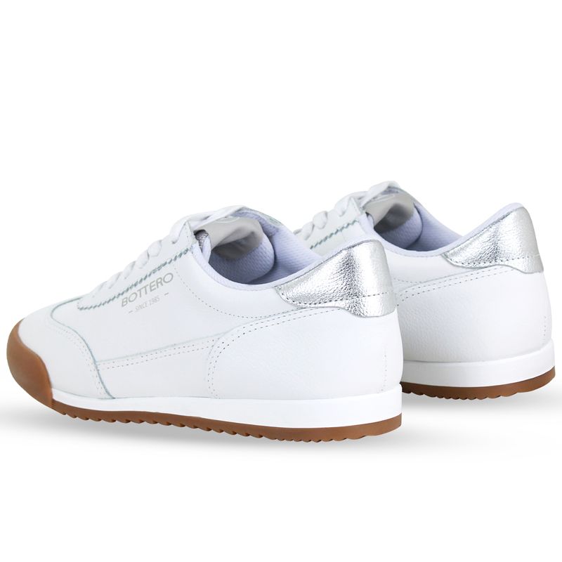 Tênis em couro napa branco. De solado rasteiro na cor natural. Possui detalhe em couro metalizado roma prata no traseiro e fechamento em cadarços.