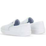 Tênis em couro veneza branco. De solado rasteiro branco. Possui elástico nas laterais, facilitando o calce.