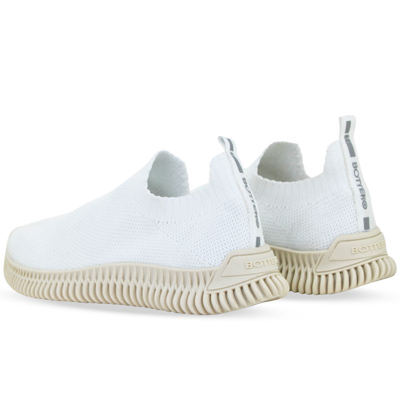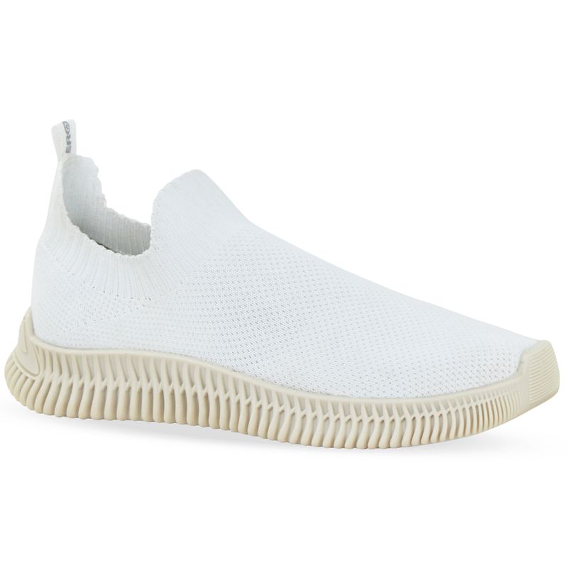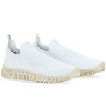 Tênis em malha knit na cor branco. De solado bege com puxador traseiro com o nome da marca. Super confortável.